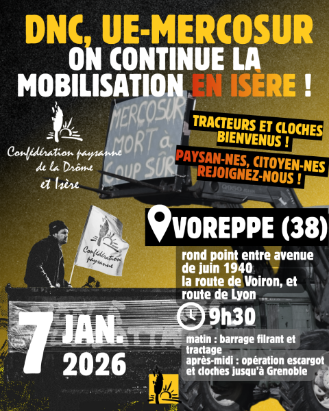 ON NE SE LAISSERA PAS ABATTRE, nos fermes ne seront pas sacrifiées sur l'autel de leurs profits ! Rendez-vous au rond-point de Voreppe à 9h30 pour la matinée et le déjeuner. L'après-midi, une opération escargot partira direction Grenoble. Mercosur, abattage, PAC, on ne lâche rien ! ...