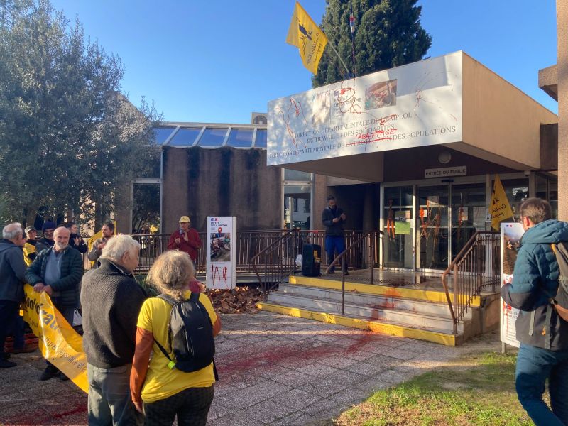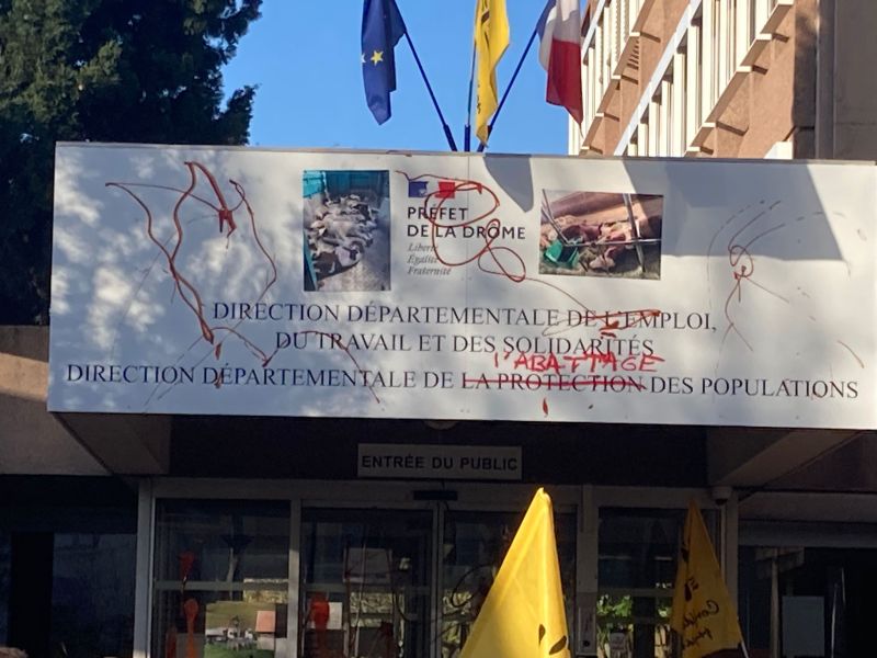 En couvrant de sang l'entrée et les portes de la Direction départementale de la Protection des populations, (rebaptisée Direction départementale de la Protection l'ABATTAGE des populations), la Confédération paysanne dénonçait la violence et l'inefficacité de l'abattage total des troupeaux.
