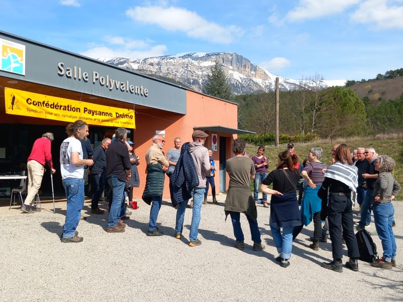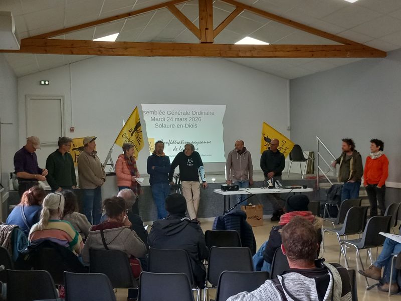 24.03.2026 - Solaure-en-Diois.La matinée était consacrée au temps statutaire, avec la traditionnelle présentation des rapports d'activité, moral, d'orientation et financier. La nouvelle équipe du Comité Départemental a été élue à l'unanimité, elle est composée de dix paysan·nes :