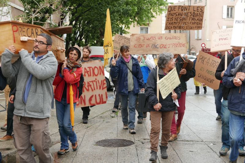 C'est au son de la cornemuse et de la flûte que le cortège s'est mis en route parc Jouvet et a déambulé dans les rues de Valence jusque devant la Préfecture puis la DDT (Direction Départementale de Territoires). Le cercueil en premier puis une multitude de pancartes et slogans signifiant notre ...